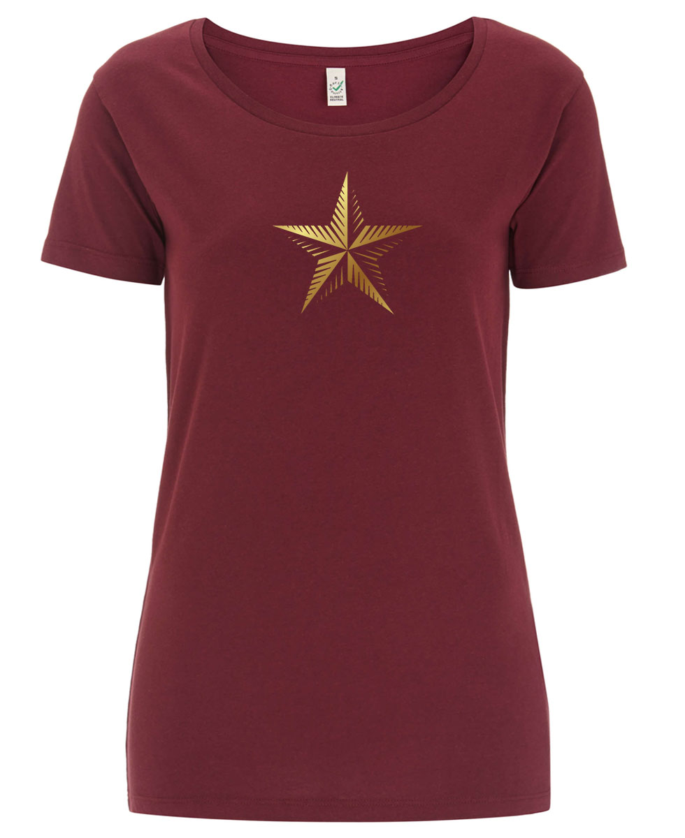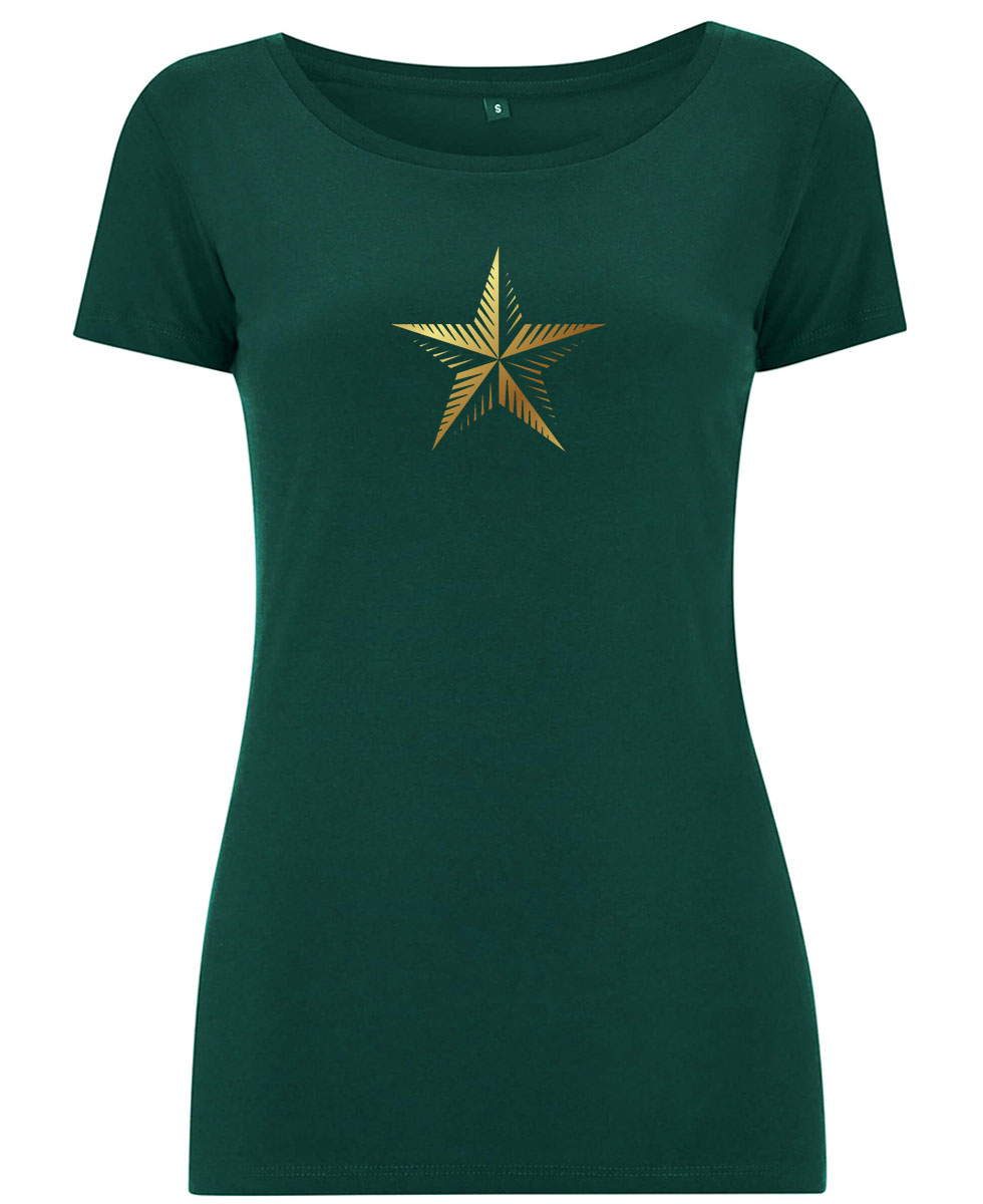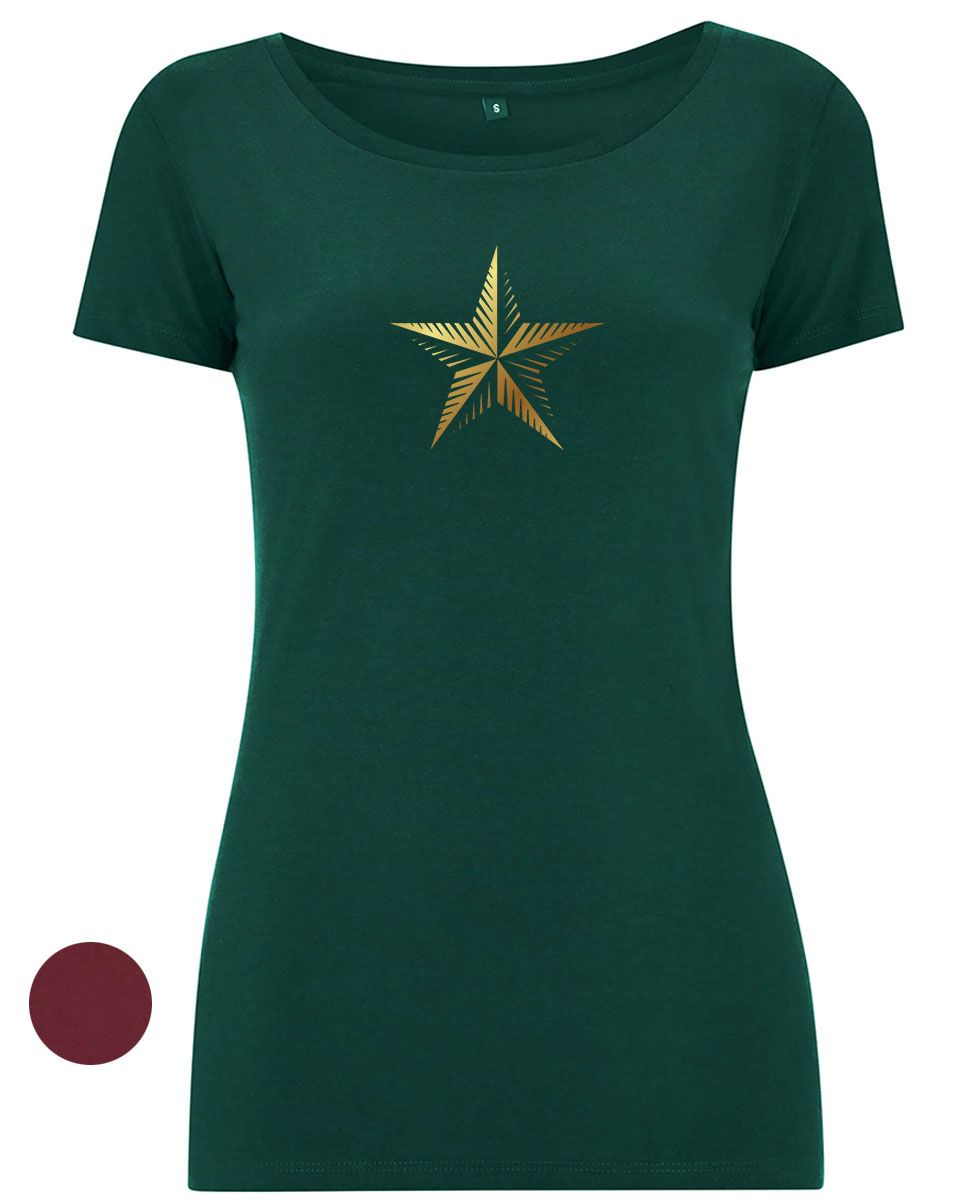 Goldene Sterngrafik auf fairwear T-Shirt. Dieses Shirt schimmert gülden.
