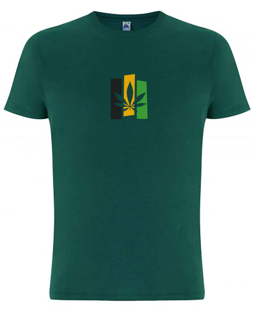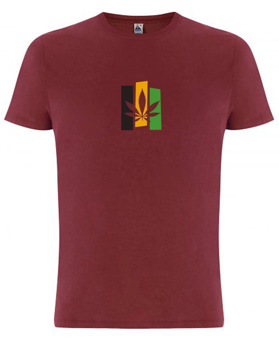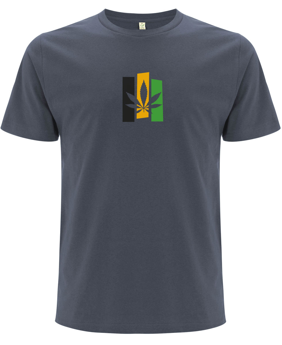 Zum Inhalt springenUnisex Bio-T-Shirt mit Hanfblatt-Motiv in den Landesfarben Jamaikas. Made für hanfansage.at in Meidling.