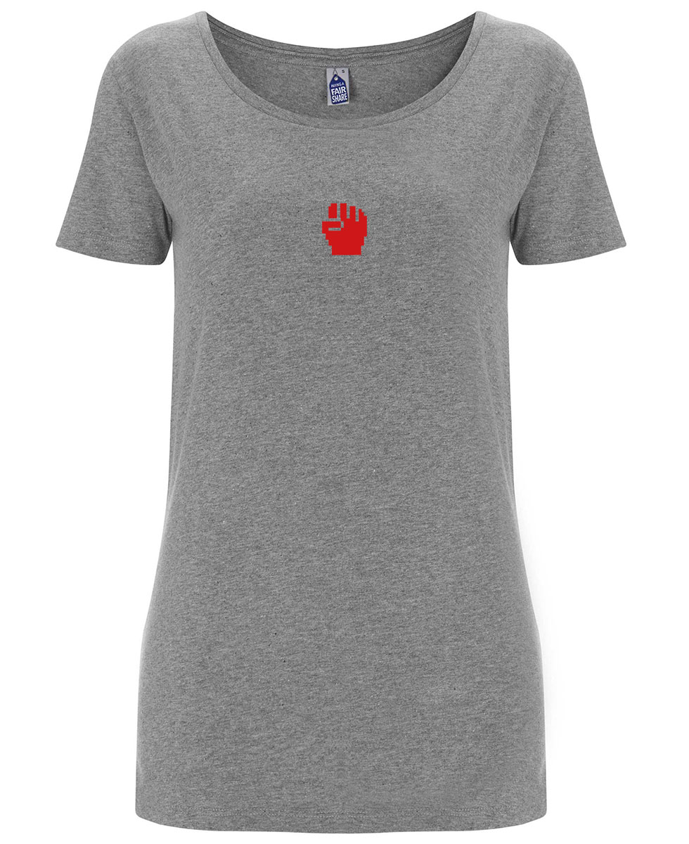 Bestimmt und deutlich. Das rote Fausterl auf melange-grauem T-Shirt. Dieses Shirt bezieht unmissverständlich Position ohne gleich den Holzhammer zu schwingen. Und das mit einer Kombination aus historischer Symbolik und aktueller Ästhetik.