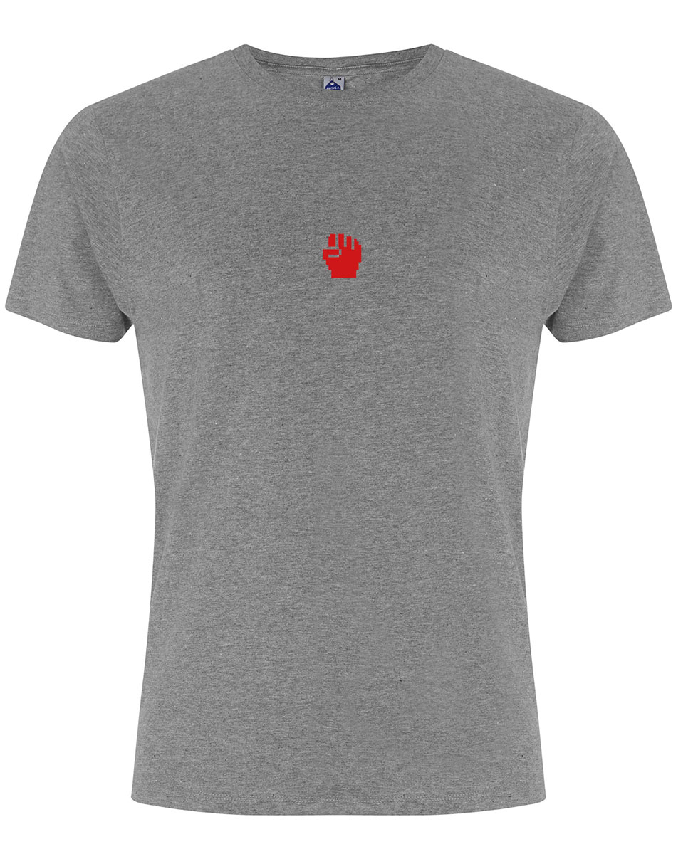 Bestimmt und deutlich. Das rote Fausterl auf melange-grauem T-Shirt. Dieses Shirt bezieht unmissverständlich Position ohne gleich den Holzhammer zu schwingen. Und das mit einer Kombination aus historischer Symbolik und aktueller Ästhetik.