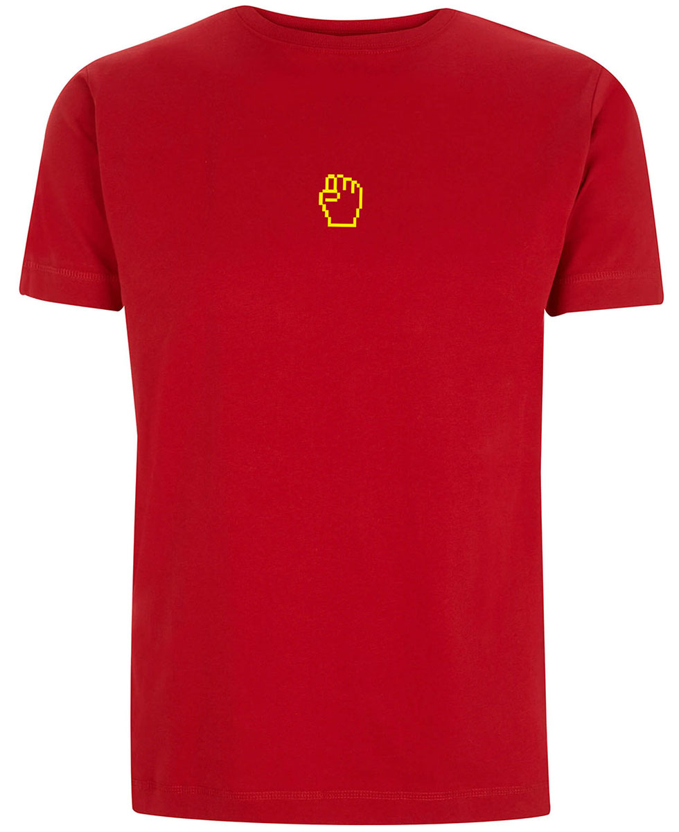 Bestimmt aber unaufdringlich. Das linke Fausterl auf rotem T-Shirt. Dieses Shirt bezieht unmissverständlich Position ohne gleich den Holzhammer zu schwingen. Und das mit einer Kombination aus historischer Symbolik und aktueller Ästhetik.